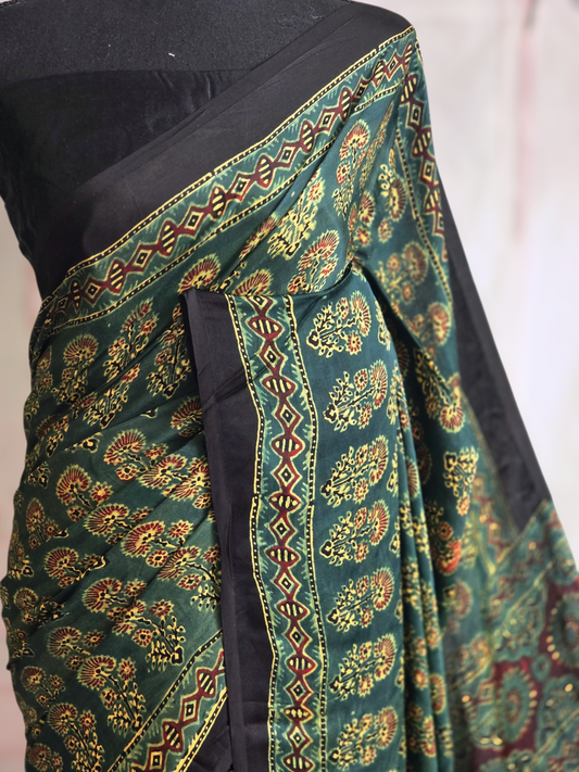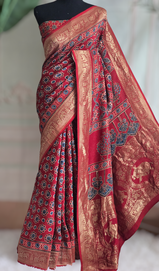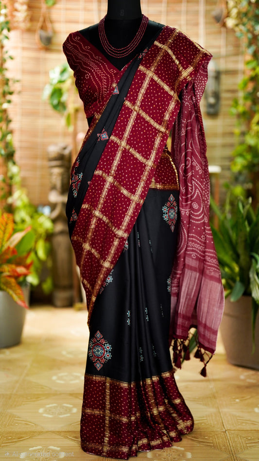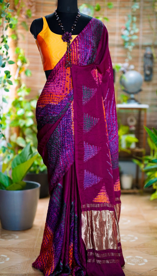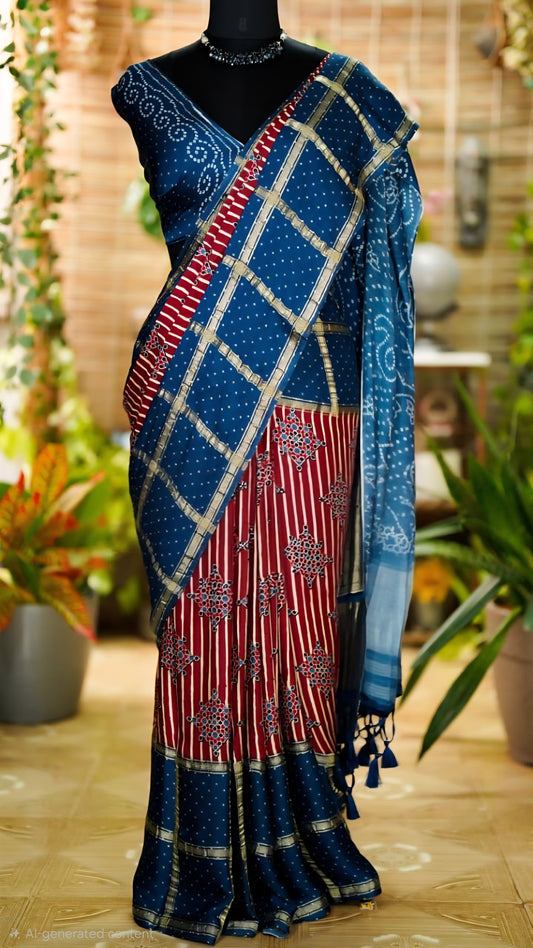 Pure gajji silk saree with ajrakh print and bandhej design- stitched blouse