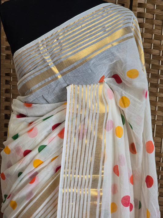 Mul cotton saree with multi color polka dots and border (fall and pico done)NO Blouse piece