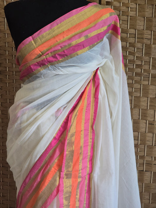 Mul cotton saree with multicolor border (fall and pico done)NO Blouse piece