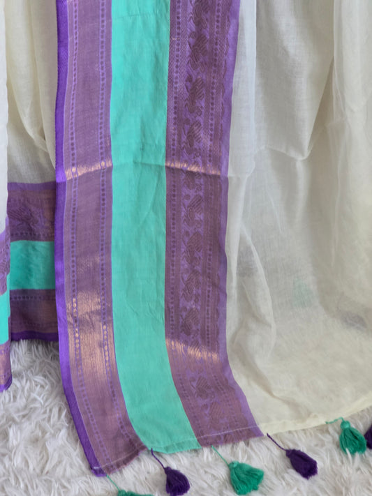 Mul cotton saree with sea green /lavdner border (fall and pico done)NO Blouse piece