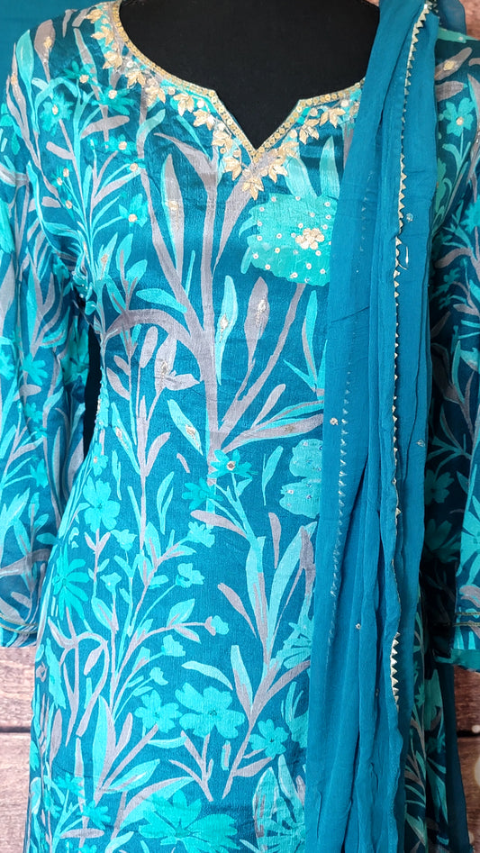 Dark bottle green organza saree with Scallop and Thread work with stitched blouse