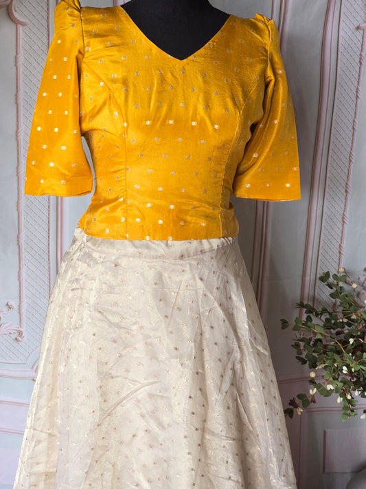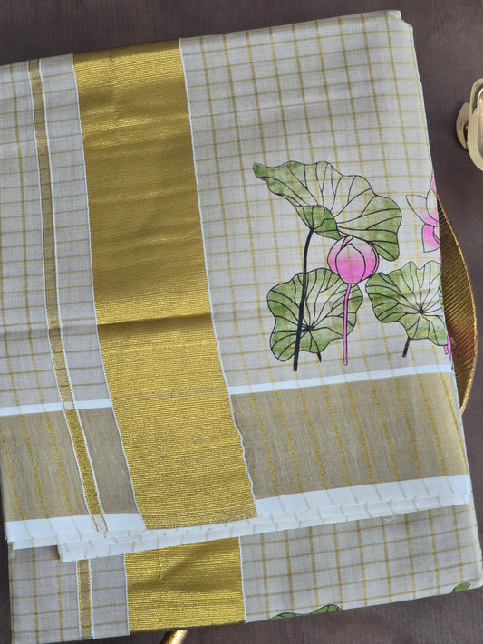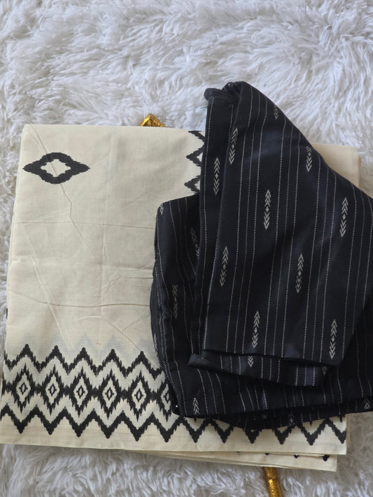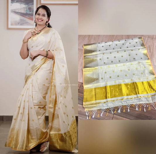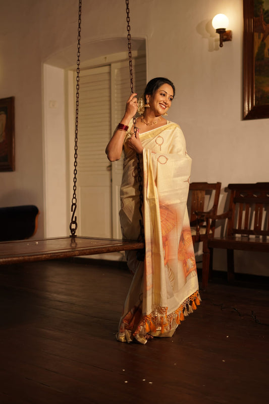 Exclusive onam tissue saree with tradition lady pic print design- stitched Blouse