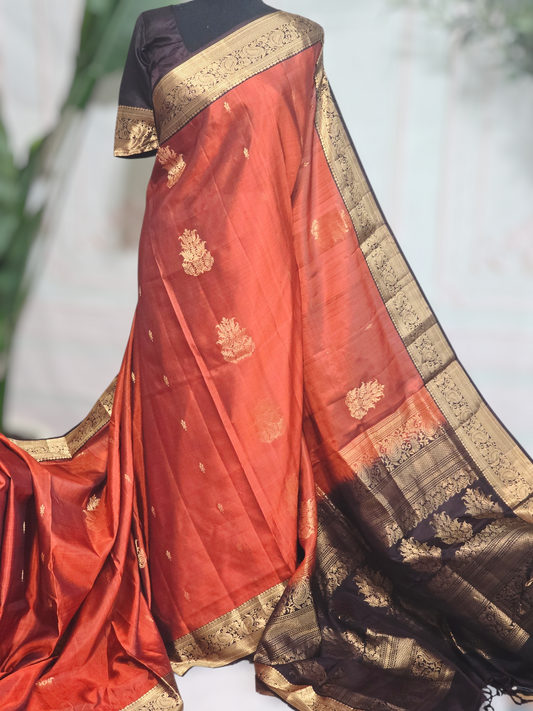 Burnt orange/brown pure kancheepuram silk mark saree with stitched blouse/fall/pico