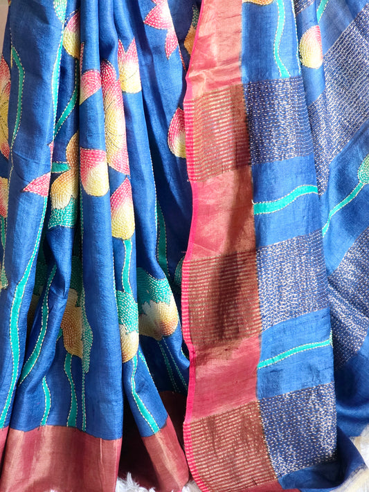 Pure tussar silk saree with kantha work weaving- stitched blouse