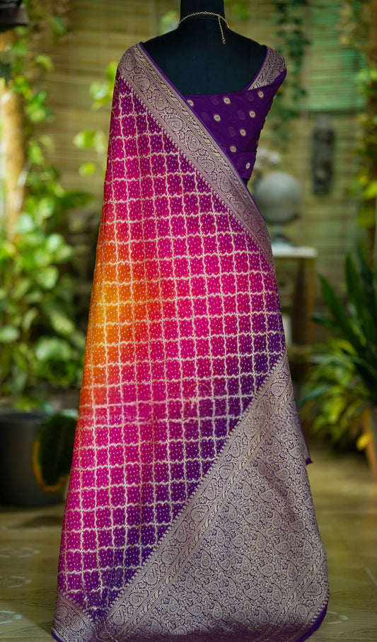 Khaddi Georgette 3-dye combo bandhej design with stitched blouse