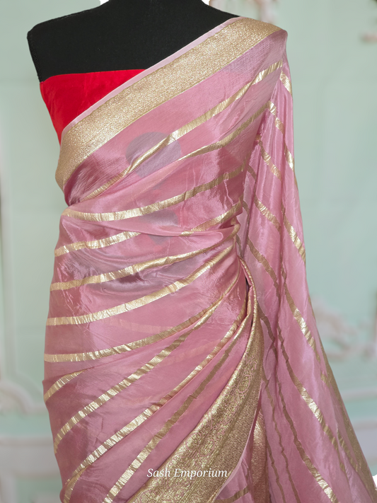 Rose gold chiffon organza saree with antique gold border- No Bp