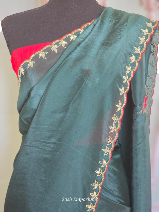 Soft organza party wear saree (bottle green) with scalloped border- gotapaty work- No BP
