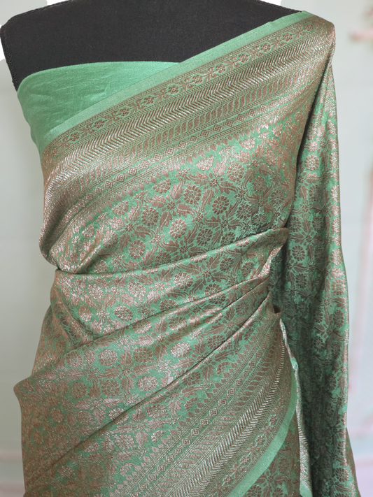 Semi katan silk saree(mint green) with silver/antique design- stitched blouse