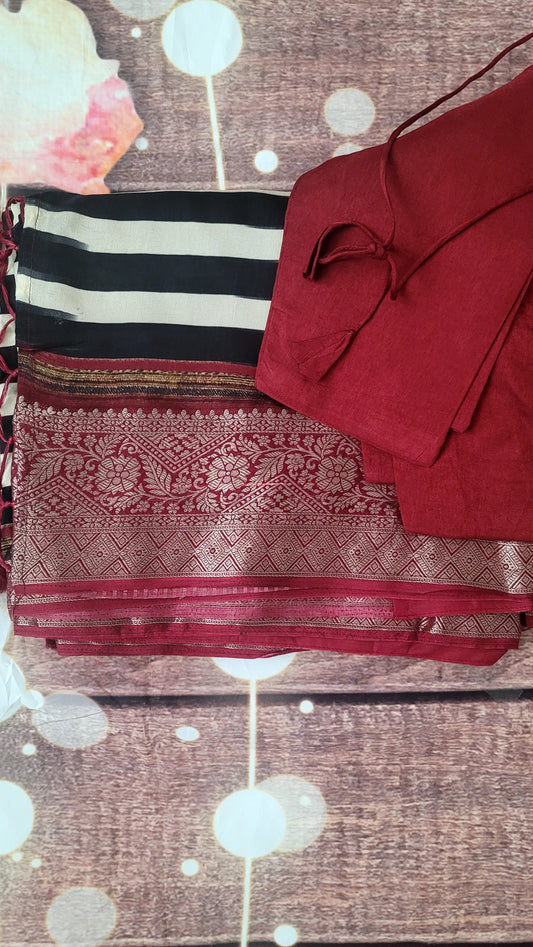 Black n maroon banarasi silk saree with antique border- stitched blouse