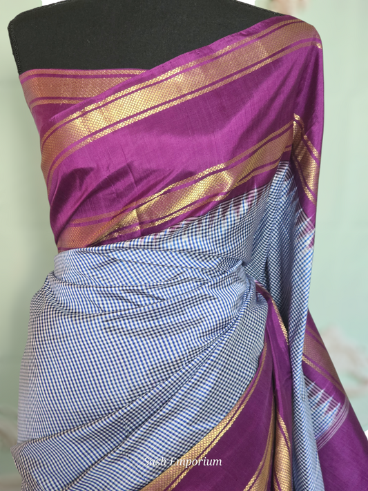 Pure silk ikkat handloom saree( blue check) with stitched blouse