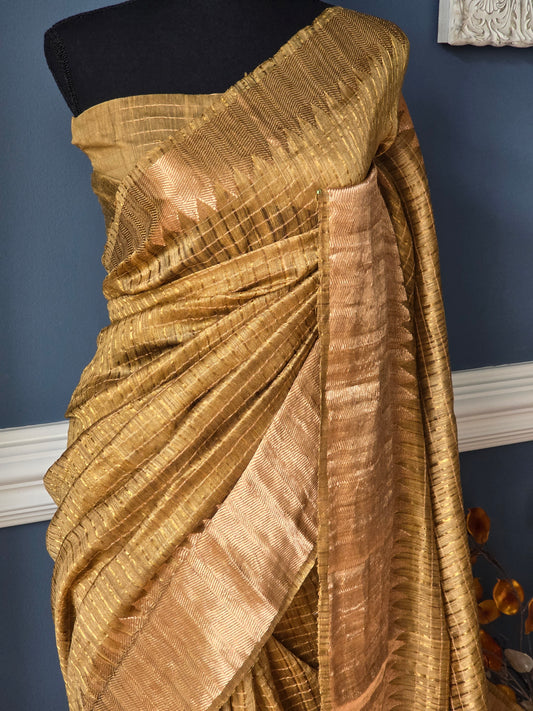 Yellowish gold matka silk saree with gold zari border- stitched blouse