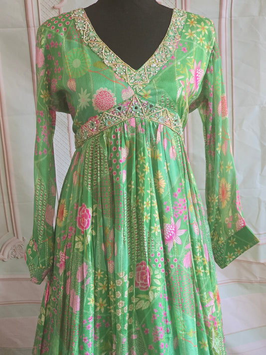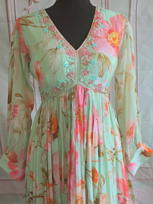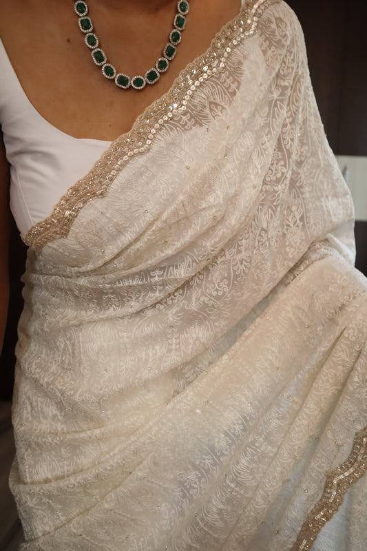 Georgette saree chilankari work and cutdana/ stone work border- stitched blouse