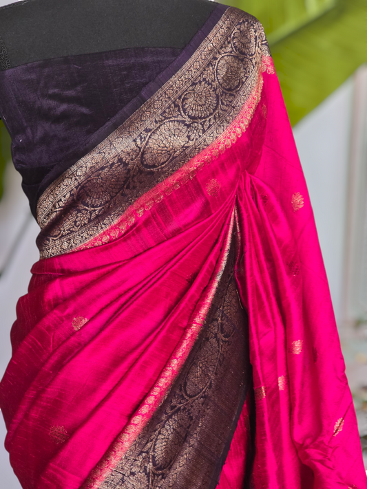 Tussar raw silk saree with banarasi border- contrast blouse (blue)