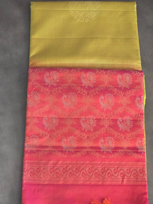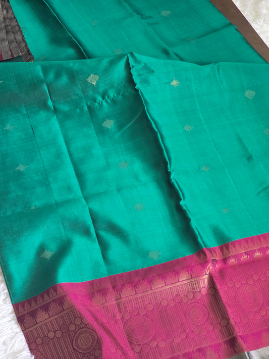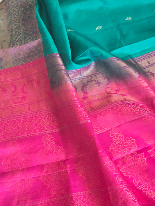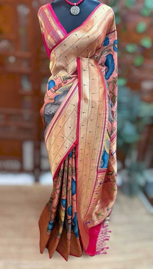 Katan dupion silk saree with digital kalamkari print with muniya weaving border- stitched blouse