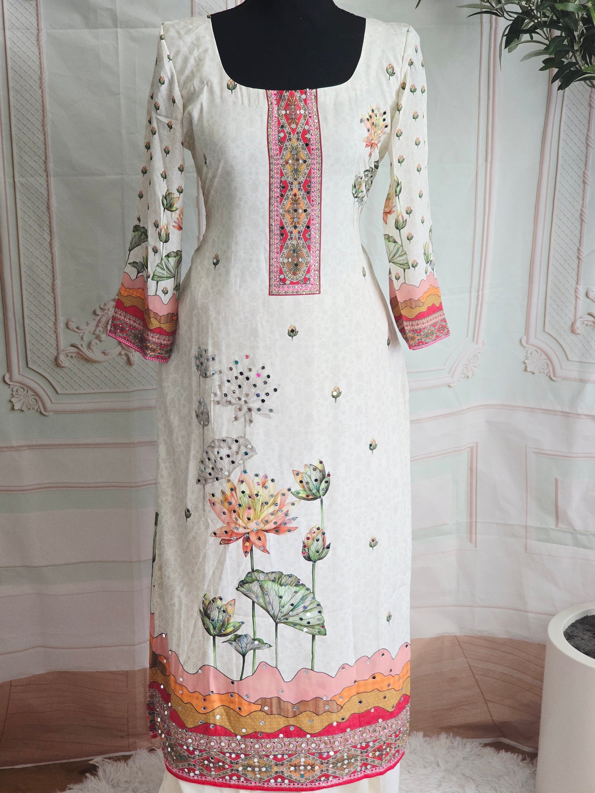 Crape 3 pc salwar suit set embellished with lotus print and mirror work