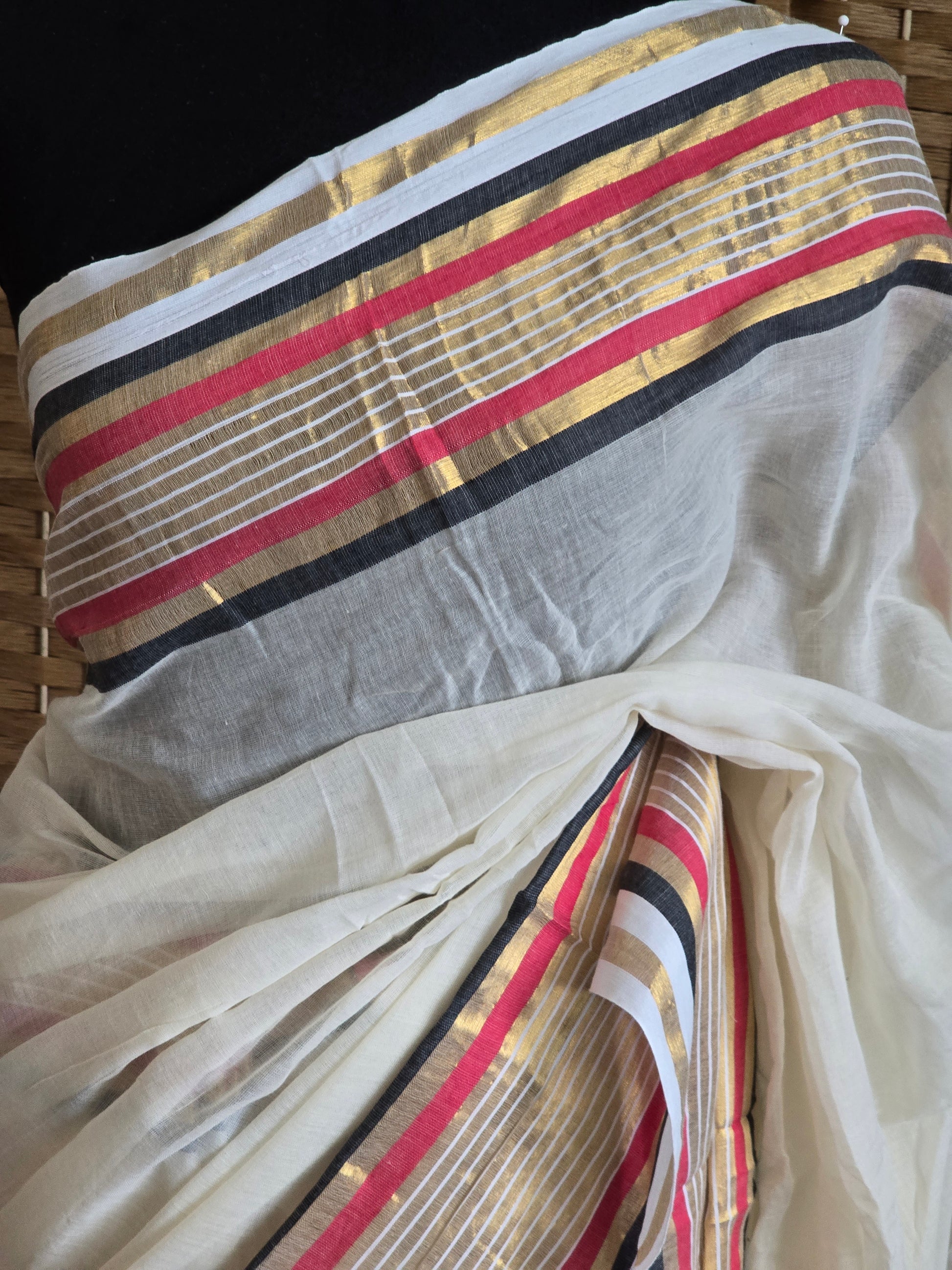 Mul cotton saree with black/gold/red border (fall and pico done)NO Blouse piece