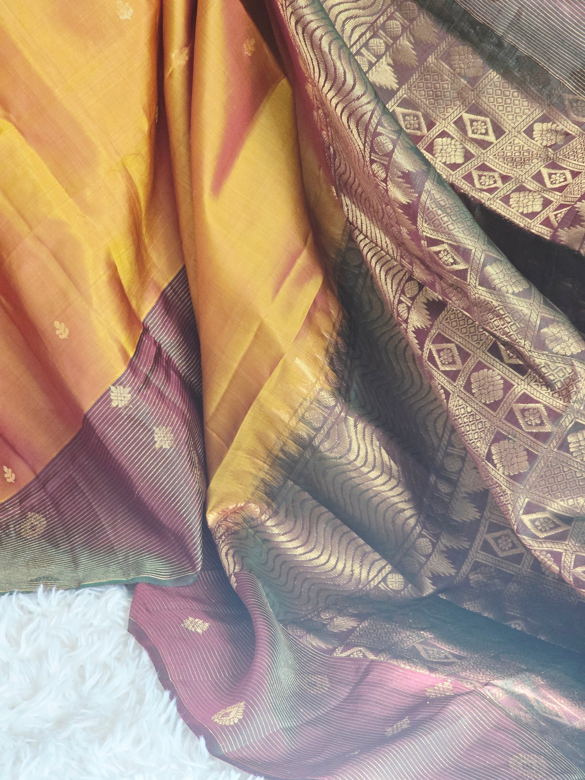 Soft silk kancheepuram(mutard yellow greenish brown)saree with stitched blouse/falln pico