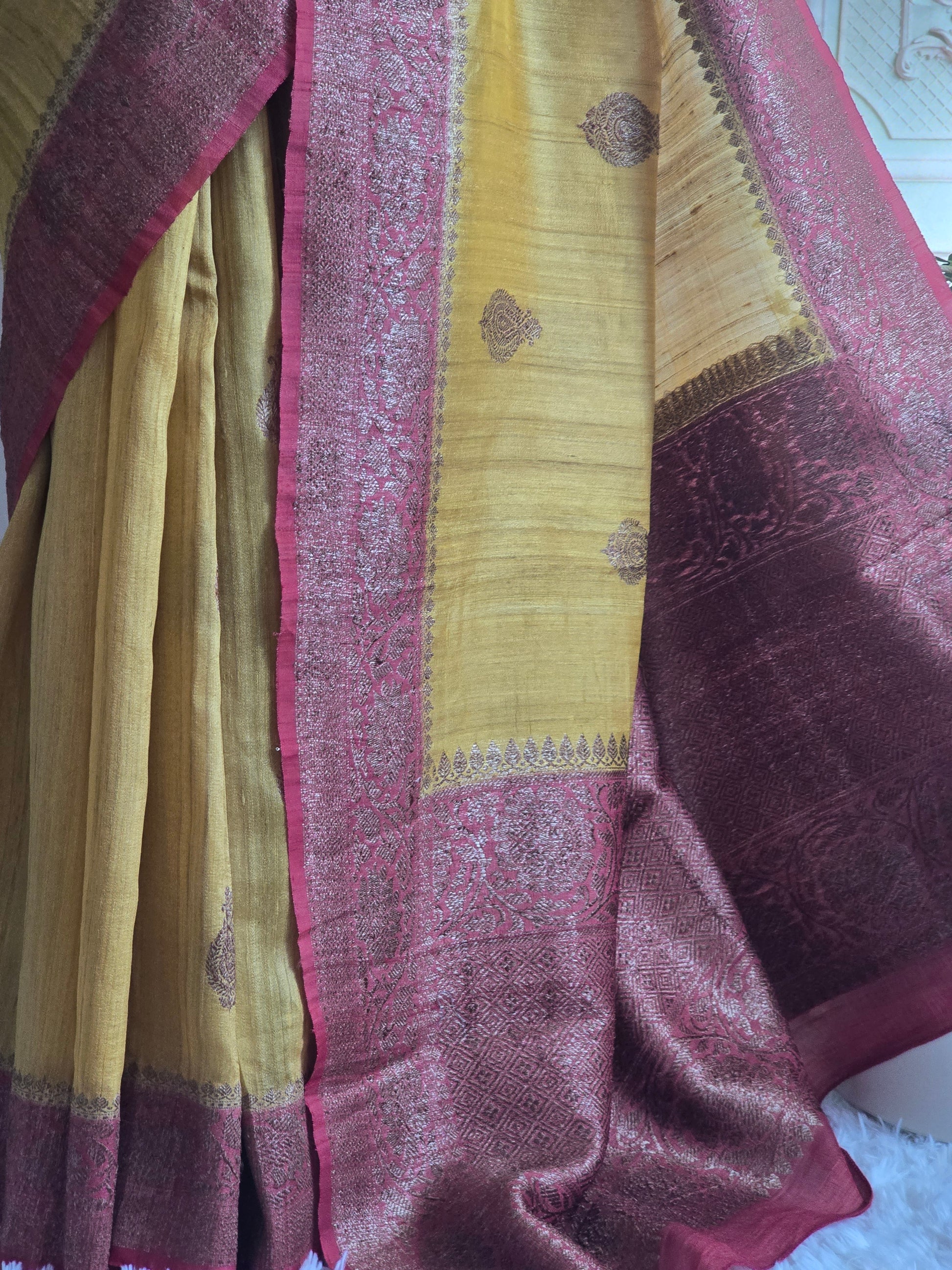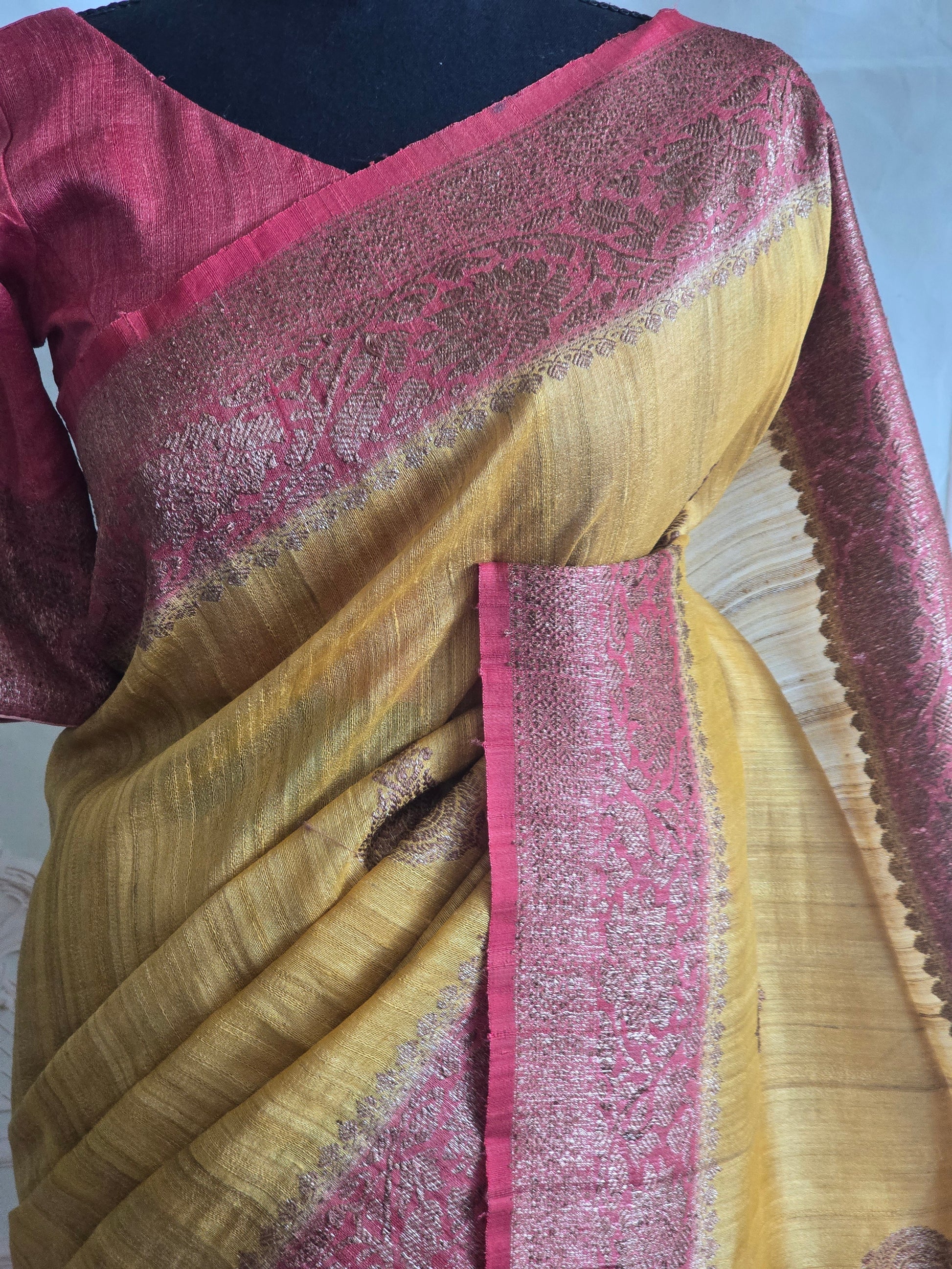 Tussar banarasi saree with stitched blouse ( yellow- watermelon)